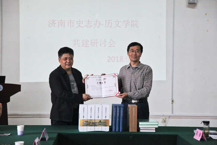 随后,举行赠书仪式。牛瑞斌书记代表历史与文化产业学院接受捐赠(藏书共31套、54册,总价值25000余元)并致辞。牛书记总结道,本次研讨会为学院在历史文化的研究领域提供了良好的经验、借鉴和平台,希望双方发挥各自优长,一起为建设山东“文化大省”和济南历史文化名城做出新的贡献。