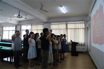专题党课第一项内容“迎七一历文教工党员重温入党誓词”,在牛瑞斌书记的带领下,全体党员重温了入党誓词。面对党旗,重温誓词,铿然在耳,大家感慨万端,在这一刻,作为党员,境界得到净化,思想得到新的提升。