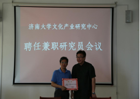省社科院文化所涂可国所长代表兼职研究员讲话,表示愿意与文化产业研究中心通力合作,共享资源和发展成果,并赠送由他主编的《山东蓝皮书:山东文化发展报告2015》。中心主任江奔东教授最后表示,中心将本着开门办平台的精神,以“中心十三五规划”为重点做好自己的工作,为学院和学校的发展贡献力量。