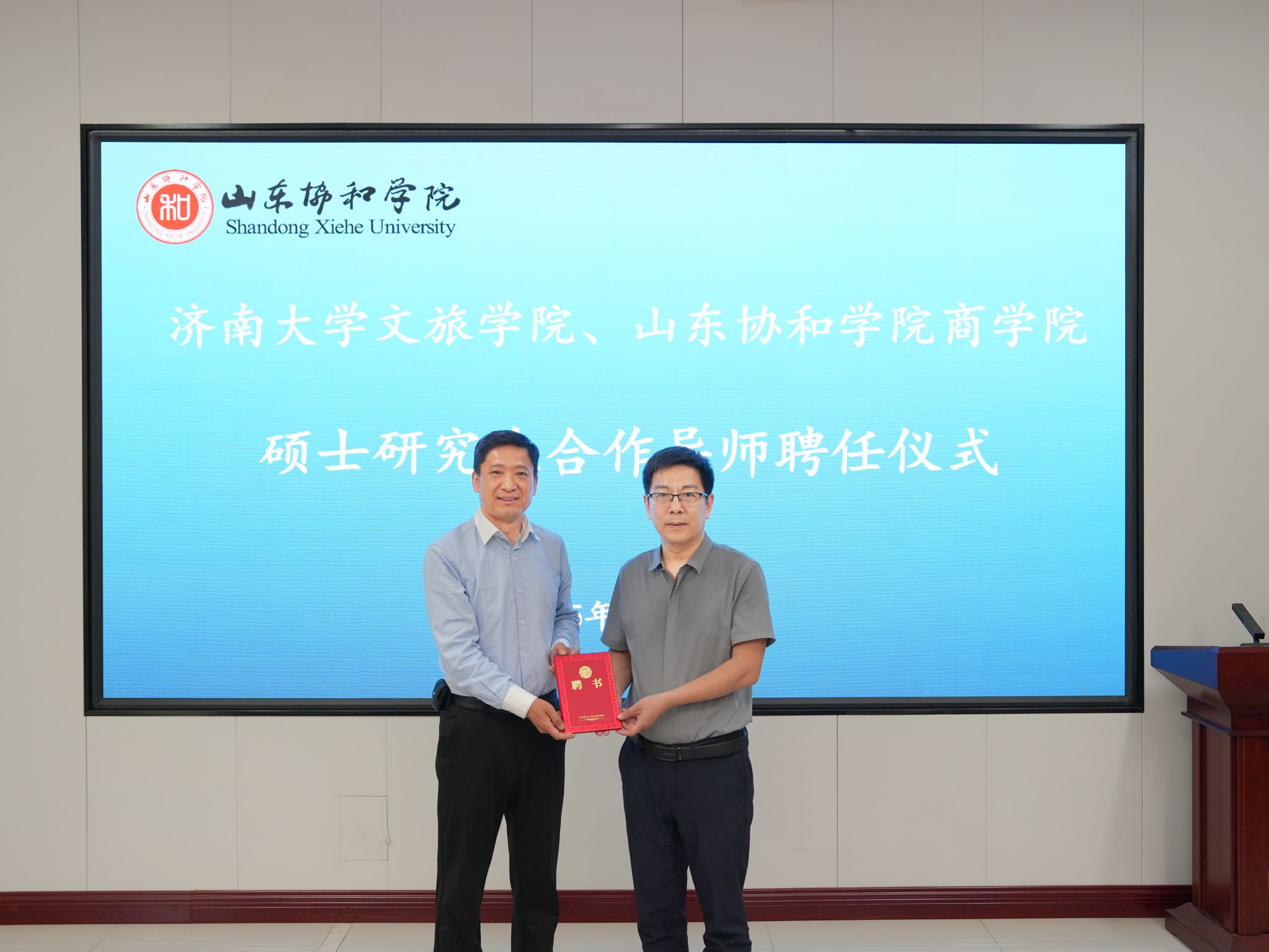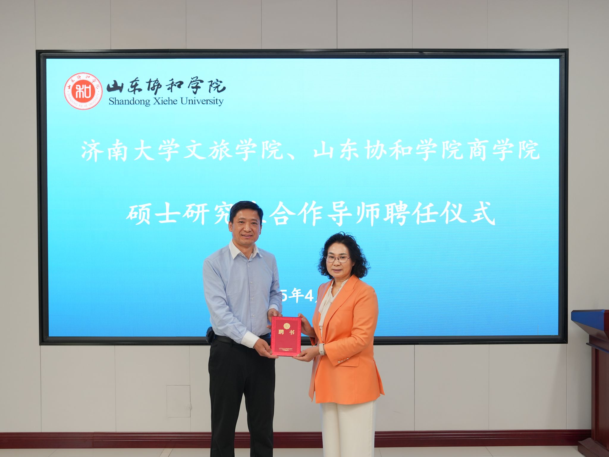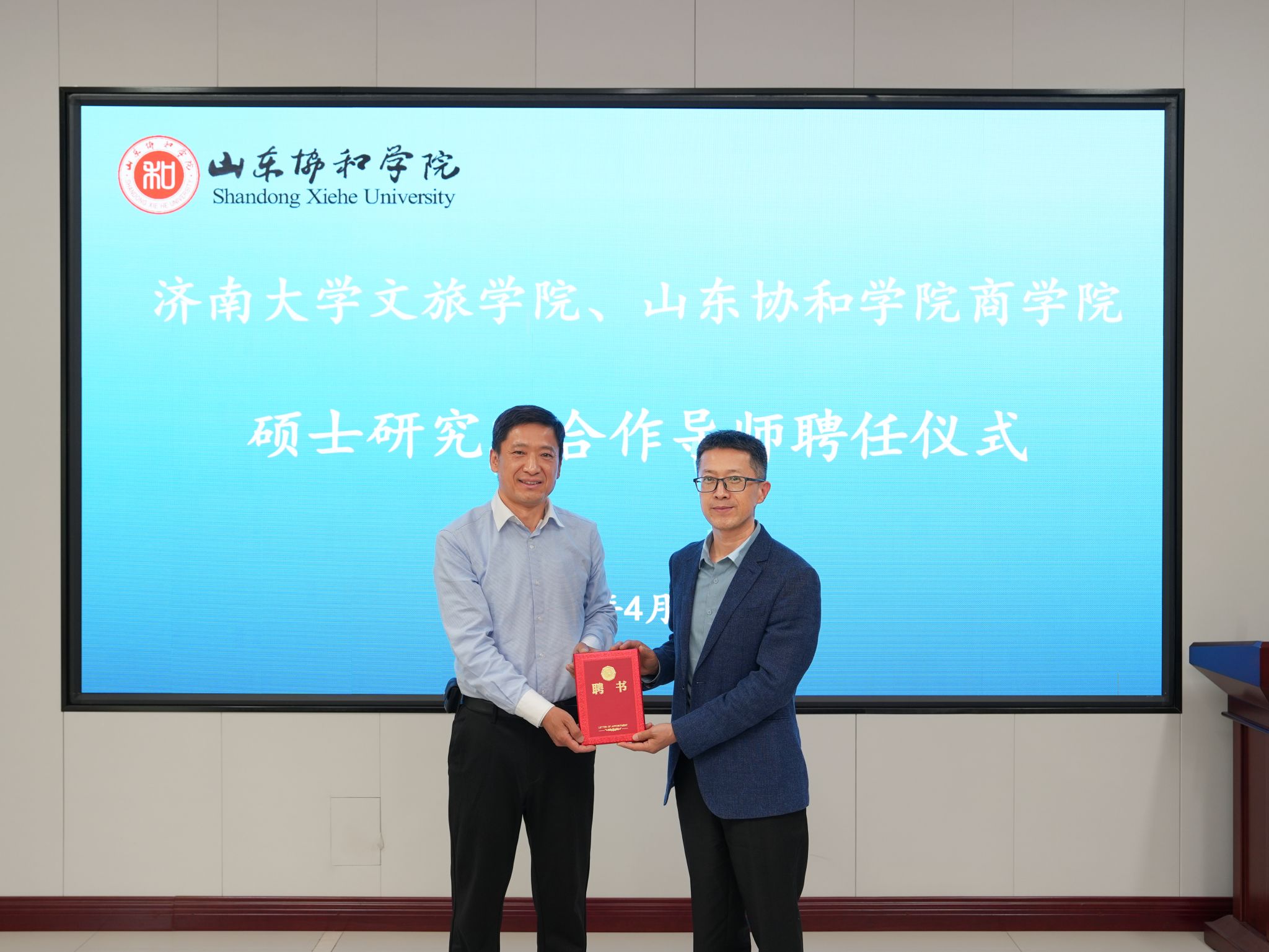 随后孟德洋向我校研究生院聘任的山东协和学院的3位MTA兼职校外指导教师(合作导师)颁发了聘书,标志着双方在人才培养和学术研究方面的合作进入了一个新的阶段。