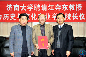 范跃进书记在聘任仪式前发表了热情洋溢的讲话。他说,学校成立历史与文化产业学院,并聘任原山东艺术学院副院长、博士生导师江奔东教授为学院院长,是适应学校科学发展的要求,对学校学科建设重新布局整合的有力举措。通过整合,集中力量培育新的学科增长点。文化产业,在山东省,乃至全国都是新的“朝阳产业”,在社会经济发展中都占据着重要的位置。希望历史与文化产业学院下一步在学科建设、人才队伍建设、办学特色等方面都有长足的发展,为山东省的文化产业发展和人才培养贡献更大的力量。江奔东教授作为文化产业专业的专家,学术造诣深厚,相信通过江奔东教授以及学院领导班子的共同努力,历史与文化产业学院一定会在新的起点上取得更好更快的发展。