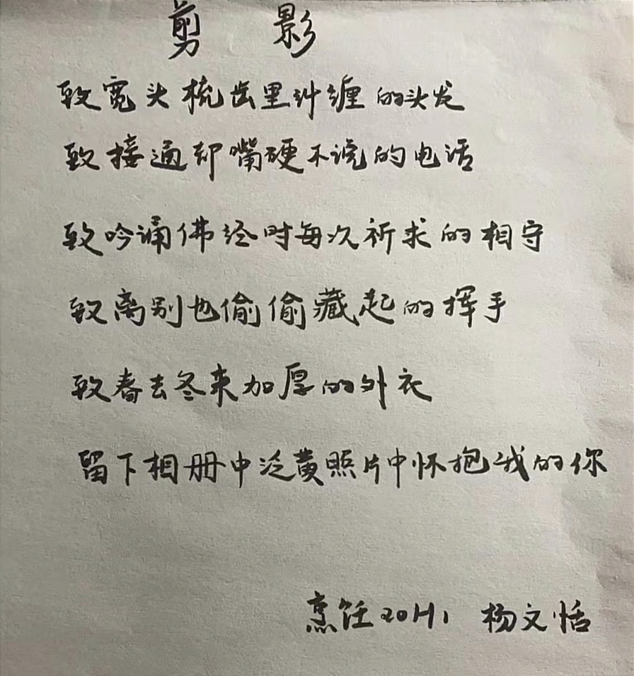 比赛开始前,青年发展部负责人在线上通过多种方式积极对活动进行了宣传和介绍,并建立答疑群为同学们答疑解惑。比赛期间,同学们踊跃报名参与,充分发挥主观能动性,围绕“致你”这一主题展开诗歌创作。诗中的“你”无论是拥有实体的人或物,还是一段难以忘怀的回忆,同学们都能将自己对其深刻的情感融入到字里行间,并通过丰富的意象和巧妙的构思使读者共感,展现出参赛人扎实的文字功底。干净整洁的字迹和别出心裁内容,无一不体现出同学们对本次比赛的重视和对文学创作的热情。最终,评审团秉持公平公正的原则评选出了本次比赛的一、二、三等奖,并对获奖人予以相应奖励,大赛就此顺利落下帷幕。