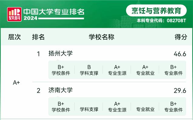 根据2024软科中国大学专业排名评级规则,专业综合排名位次为前2%或前2名的为A+级。此次,烹饪与营养教育专业成功上榜A+专业,不仅是对我院在开展专业建设的过程中取得的成果的肯定,也为我院进一步深化专业高质量建设提供了更多的动力。