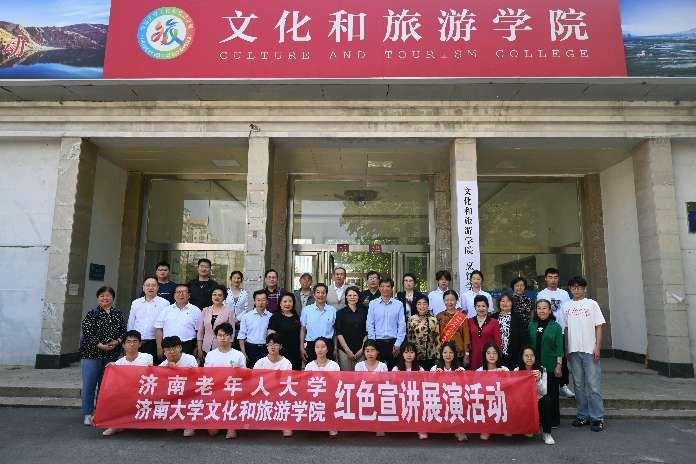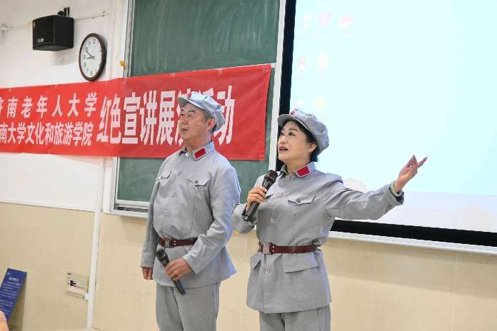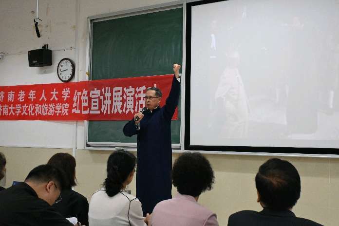 随后,济南老年人大学宣讲团和文旅学院的学生们为大家带来了一场精彩的红色文化主题文艺汇演。此次文艺汇演以传承红色基因、弘扬爱国主义精神为主线,以诗歌朗诵、红色电影配音、红色歌曲等形式讲述了革命先烈的英勇事迹和党的奋斗历程,讴歌了党的丰功伟绩和取得的辉煌成就,大家声情并茂、气势磅礴,深情抒发了对党和祖国的真挚感情。诗朗诵《太阳的形象》《大写的中国》《谁是最可爱的人》《济大的秋天》《可爱的中国》《军礼》《红色电影〈风暴〉台词》,红色歌曲《中华儿女》《老家在山东》《我和我的祖国》等一个个精彩节目,让在场的每一位观众都深受感动。