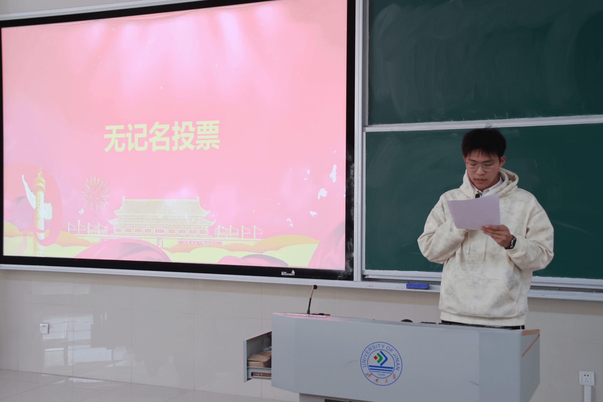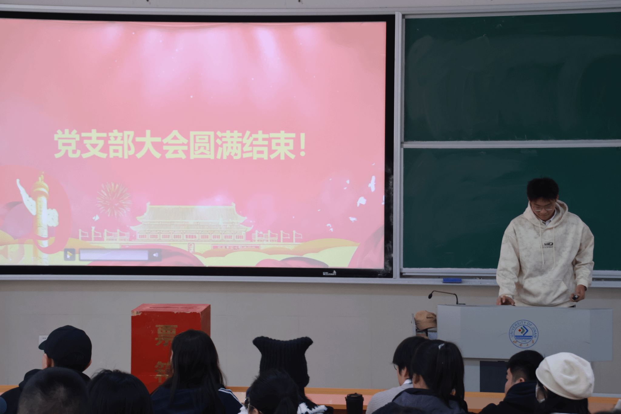 党支部在舜耕校区D3J102教室召开了接收新发展党员会议,本次大会主要讨论接收尹文琪等 43 名党员发展对象为中共预备党员的事项,由马驰原同学主持。