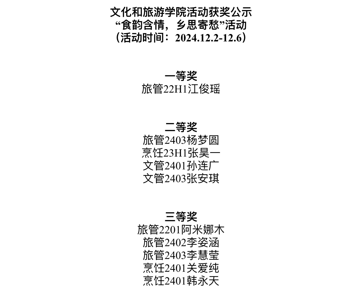 于2024年12月2日至12月6日在线上成功举办了“食韵含情,乡思寄愁”活动,本次活动面向学院全体同学。