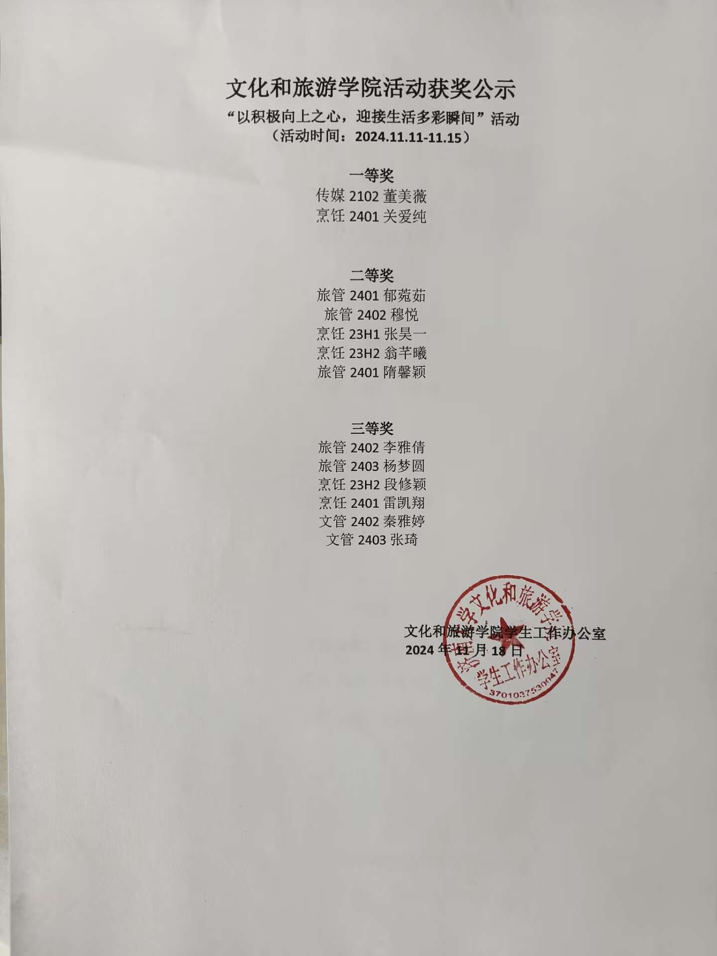 在本次活动中,传媒2102董美薇、烹饪2401关爱纯两位同学获得一等奖,旅管2401隋馨颖、旅管2401郁莞茹和旅管2402穆悦三位同学获得二等奖。