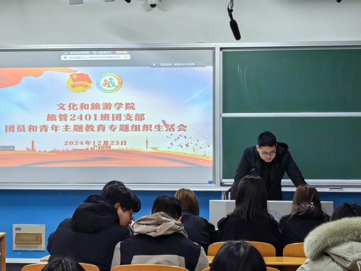 开展2024年度示范性团员和青年主题教育专题组织生活会,会议由孙元伟同学主持,学院团委书记吕龙飞老师、旅管2401团支部16名团员及2名优秀青年代表参加会议。