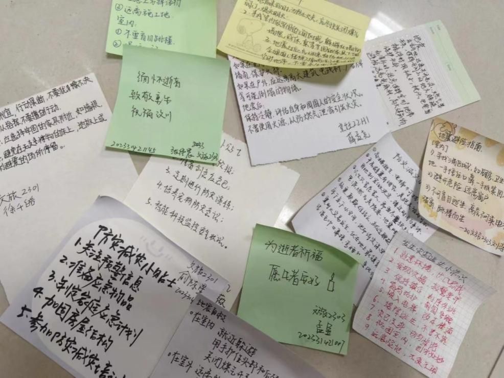 活动伊始,同学们进行了短暂的默哀仪式,表达对汶川地震中遇难同胞的深切哀悼和对灾区人民的关心。随后,他们在便利贴上写下自己所了解的防震减灾小知识,如“密切关注预警信息”、“提前准备应急物质、制定应急方案”等,并将这些便利贴粘贴到活动展板上。