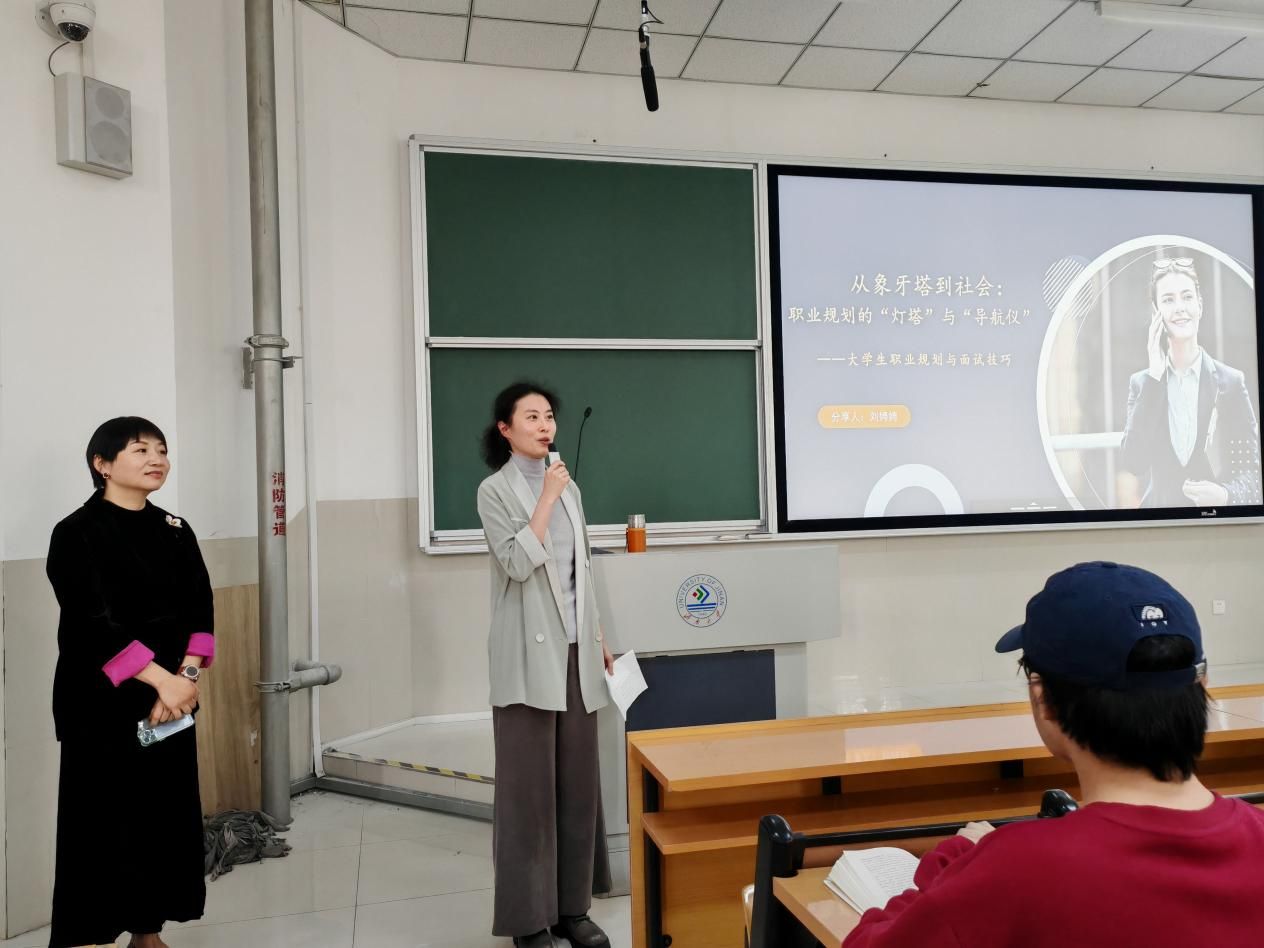 讲座伊始,刘娉娉校友以"从校园到职场"为主题,结合自身丰富的职业经历,从如何选择第一份工作、如何应对面试、入职后的适应锦囊三个部分,为同学们详细讲解了职业规划的方法与技巧。