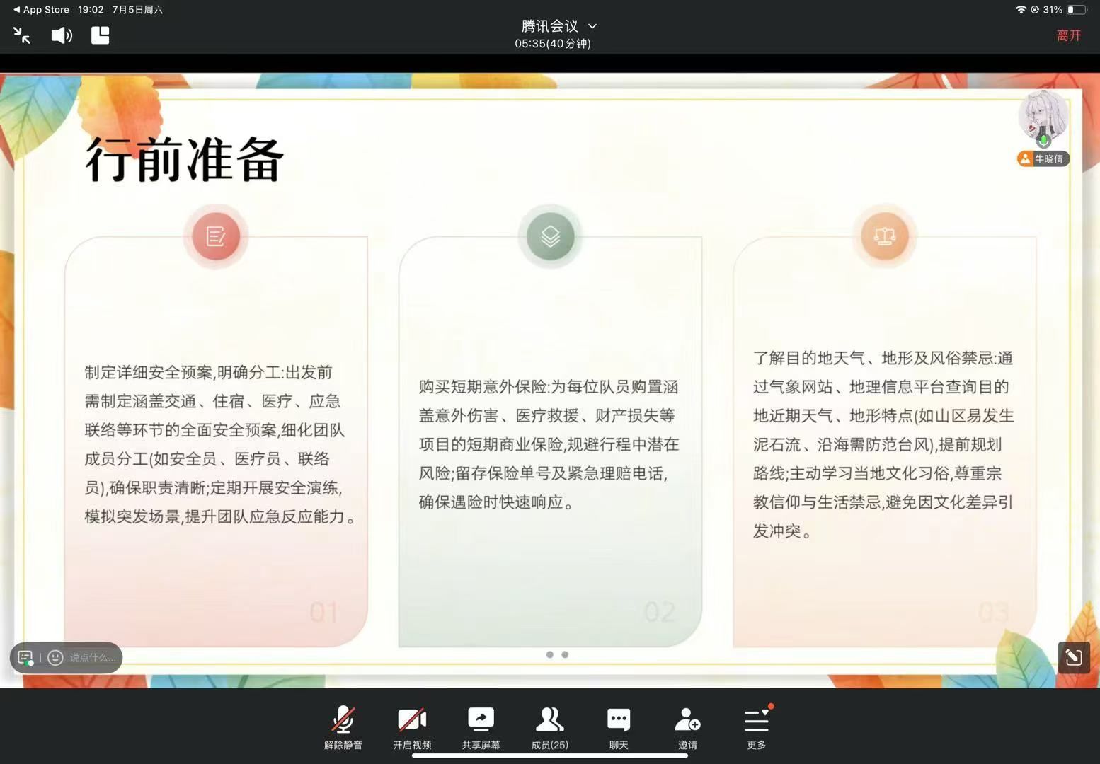 培训内容主要围绕行前准备、交通安全、生活安全、活动安全及信息安全等多个关键领域展开详细讲解。在行前准备环节,着重强调制定涵盖交通、住宿、医疗等全面内容的安全预案;在交通安全方面,指导学生选择正规交通工具,乘车系安全带、骑行戴头盔;生活安全培训中,提醒学生饮用安全水源、注意饮食卫生,做好居住环境的清洁与防蚊措施;针对活动安全,强调集体行动原则,严禁靠近水库、工地等危险区域;信息安全板块,警示学生保护个人及团队隐私,谨慎发布实践相关信息。培训过程中,通过实际案例分析、互动问答等形式,让安全知识深入人心。培训结束后,杨鑫同学表示:“这次培训让我意识到,安全隐患可能藏在细节里。我学会了如何冷静应对突发状况,这些知识对即将开始的‘三下乡’实践非常实用!”