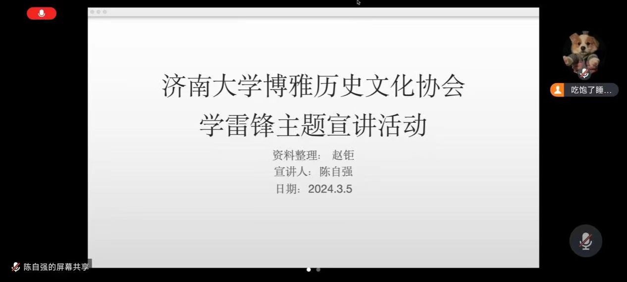 博雅历史协会开展雷锋同志历史事迹线上宣讲活动。雷锋同志的事迹和精神是中华民族优秀传统文化的重要组成部分,社员陈自强围绕雷锋同志生平介绍和雷锋精神解读两个方面展开线上宣讲。他提到,雷锋同志为人民服务,真正做到了毛主席所讲的“完全”、“彻底”;雷锋为人民为同志想得深,做得细,标准高,走到哪里就把好事做到哪里。社员们在这次宣讲中进一步了解了雷锋事迹,感受雷锋精神。