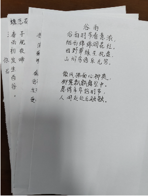同学们以“谷雨”为主题进行诗词和绘画创作,他们通过查阅资料,对谷雨节气里发生的雨润百谷这一自然现象以及祖先对丰收的深切期盼有了更为全面的了解,创作出的作品既有对春雨滋润大地的赞美,也有对农家生活乐趣的描绘。他们以诗词为媒,进而对诗词描绘的场景进行绘画创作。活动结束后,同学们将诗词和画作装订成册,赠予晓爱残障人士康复中心的孤独症儿童,希望他们能够了解自然与人类的紧密关系以及中国传统文化的独特魅力。活动参与者肖贵宾同学表示,此次活动让同学们对谷雨这一节气有了更深入的了解,也为同学们提供了为孤独症儿童献爱心的机会。