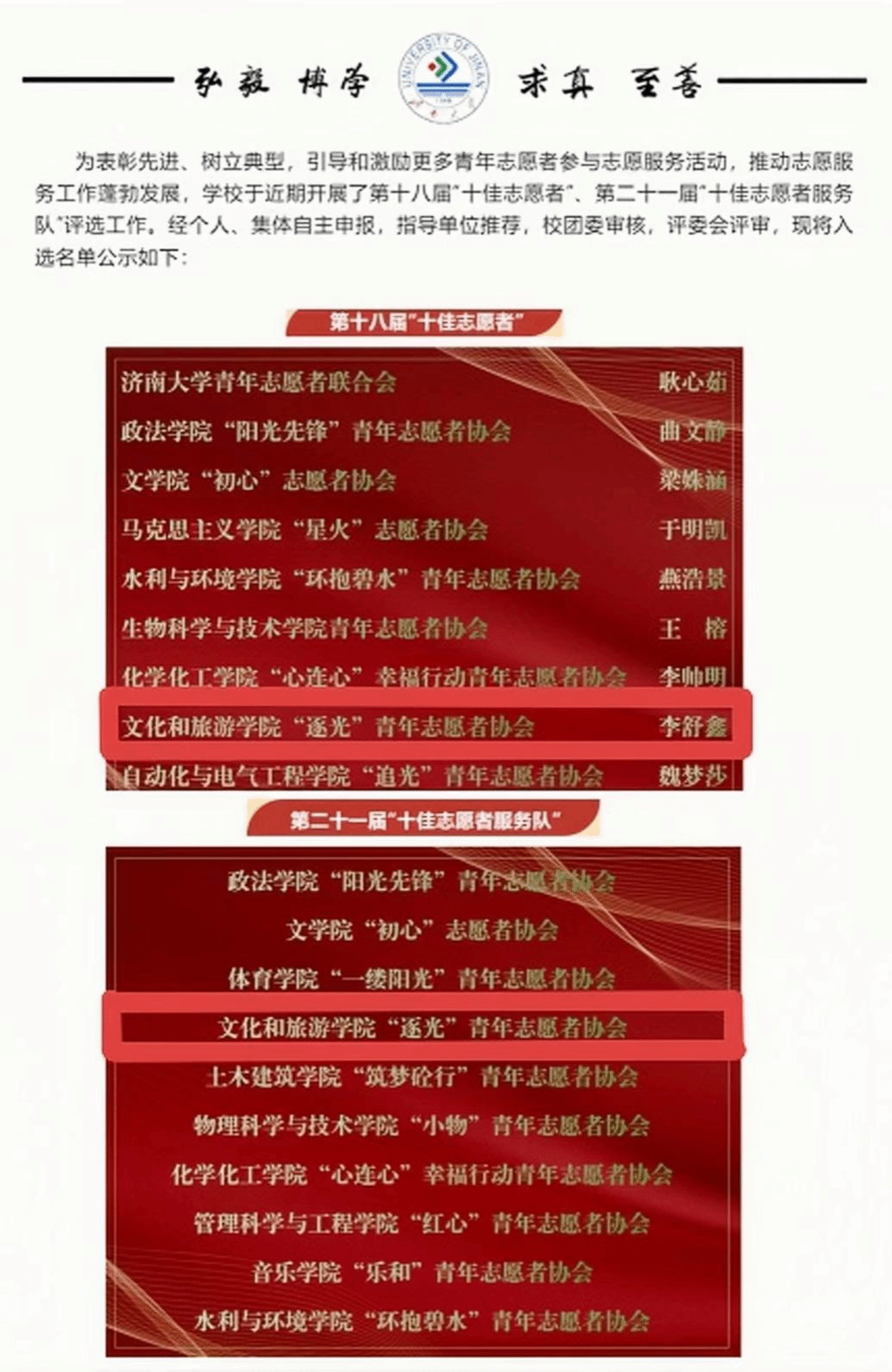 “逐光”青年志愿者协会与志愿者李舒鑫蝉联“十佳志愿者服务队”与“十佳志愿者”。荣誉称号 “逐光”青年志愿者协会自2019年成立以来,在学院党委的领导下,广泛参与敬老爱幼、社区服务、文化宣传等各类志愿服务活动。这一批在工作中有理想、敢担当、能吃苦、肯奋斗的新时代志愿者,以有组织力、服务力和凝聚力的志愿者协会为依托,整合校内外志愿服务资源,打造具有文旅特色的高质量志愿服务项目,与齐鲁晚报·齐鲁壹点联手推出名泉云支教、防治荒漠化公益课等品牌公益活动,开展“人间最美四月天”活动,同时还作为重要后勤保障辅助第三届儒商大会顺利举行等。协会志愿者以专业态度开展各类志愿服务活动,用高质量行动成果造福社会。